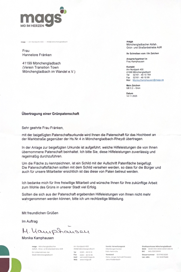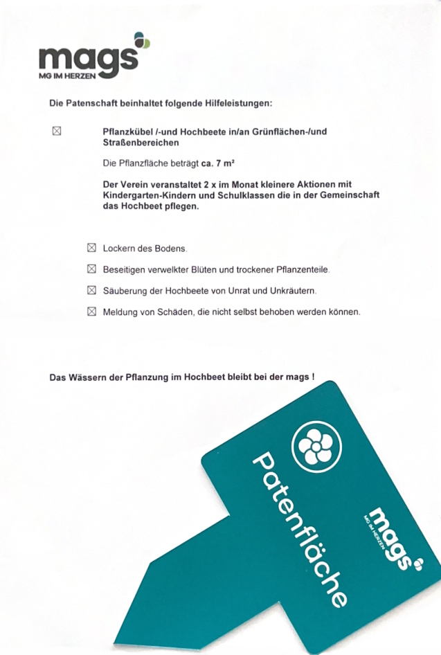 Da wir im Zentrum von Rheydt (Marktstraße) mit Kindern den stillgelegten Brunnen regelmäßig pflegen und bepflanzen, haben wir im November 2025 von mags Mönchengladbacher Abfall-, Grün- und Straßenbetriebe AöR eine Grünpatenschaft erhalten.